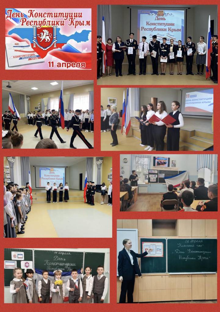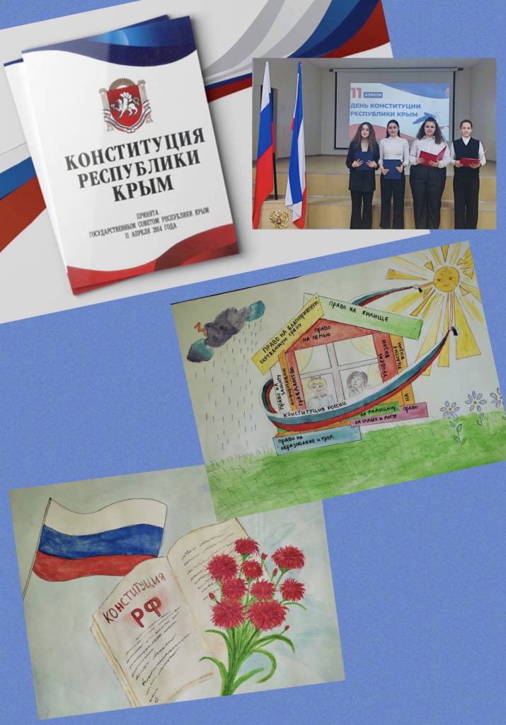 11 апреля - День Конституции Республики Крым 11 апреля Республика Крым отмечает День Конституции. В школе провели торжественную линейку, тематические классные часы, исторический диктант, квест, викторину, конкурс рисунков и стенгазет.