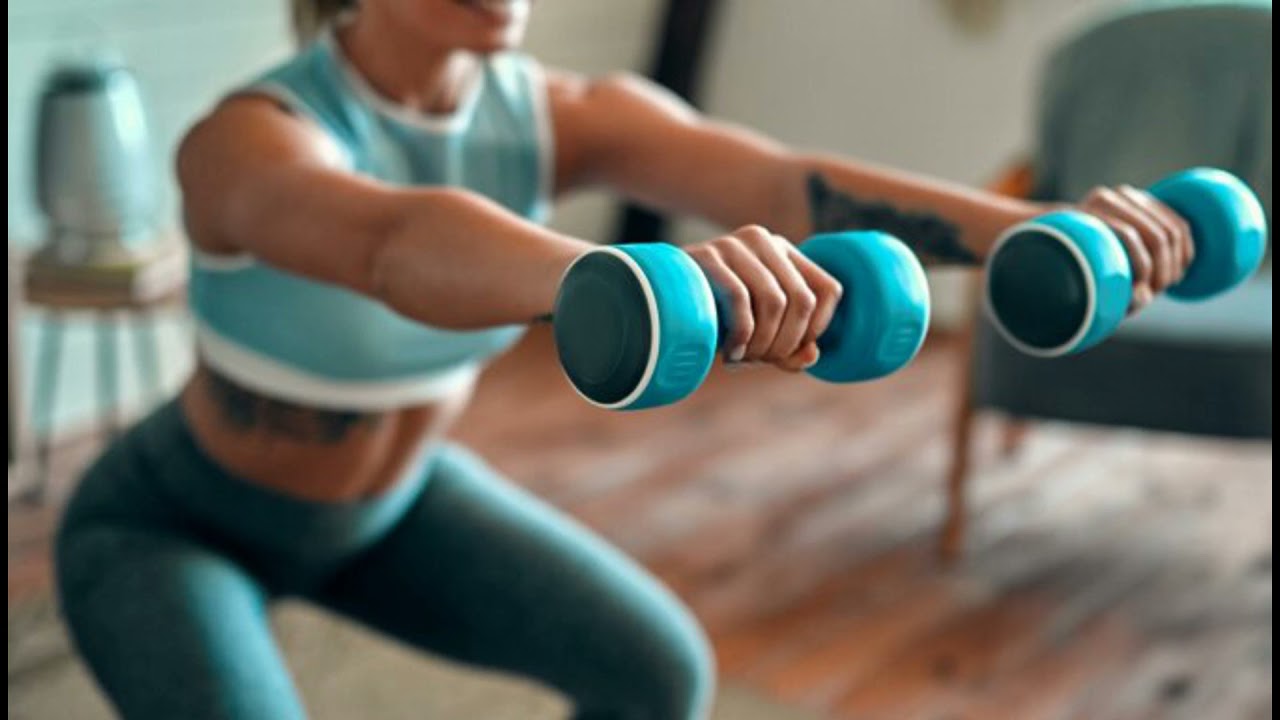 Как выполнять: Взяв гантели, выпрямитесь, прижмите руки к бедрам.